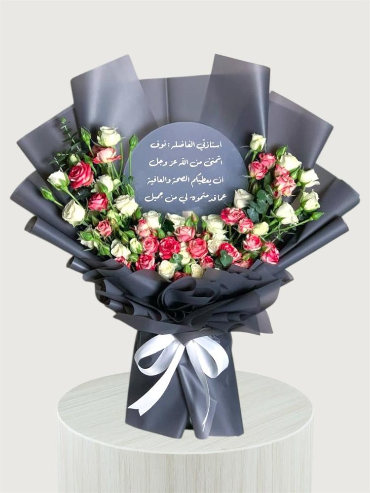 باقة ورد طبيعي بتنسيق راقٍ، مزودة بعبارة مطبوعة على لوح أكريلك أنيق من اختياركم، لتُضفي على الهدية لمسة شخصية مميزة لا تُنسى.
