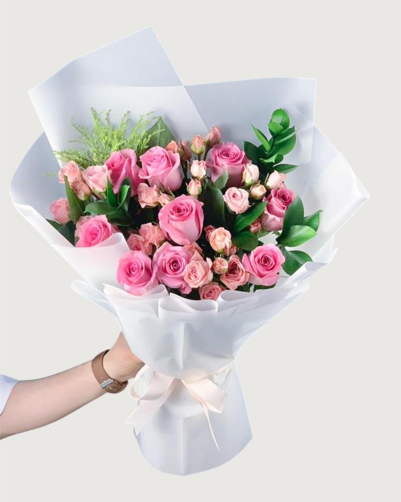 فازة زجاجية دائرية مزينة بتنسيق مميز من الورد الطبيعي، مع إمكانية طباعة الاسم الذي تختارونه على الفازة لتصبح هدية فريدة وجميلة.