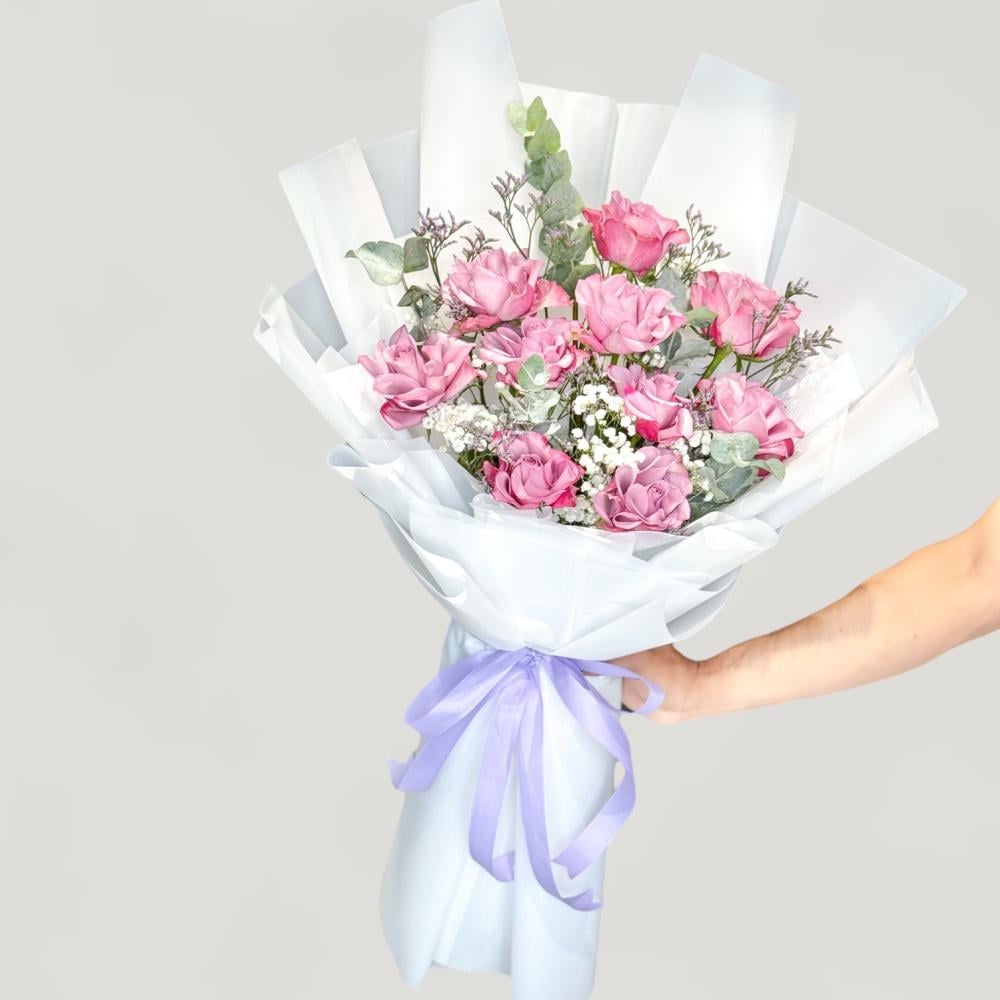باقة ورد جوري طبيعي بلون الموف الهادئ، بتغليف أبيض أنيق يبرز نعومتها ويمنحها لمسة راقية وبسيطة، تعبير مثالي عن الأناقة والرقي.