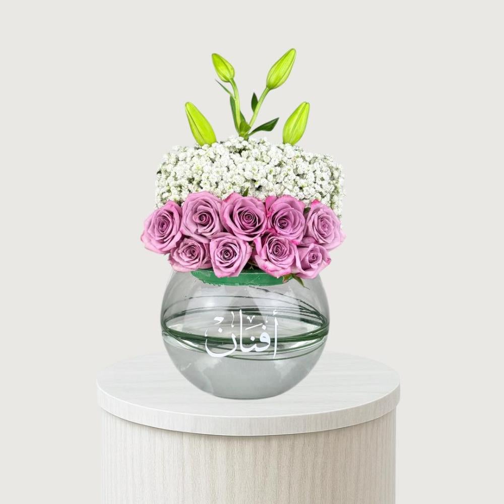 فازة زجاجية دائرية مزينة بتنسيق مميز من الورد الطبيعي، مع إمكانية طباعة الاسم الذي تختارونه على الفازة لتصبح هدية فريدة وجميلة.