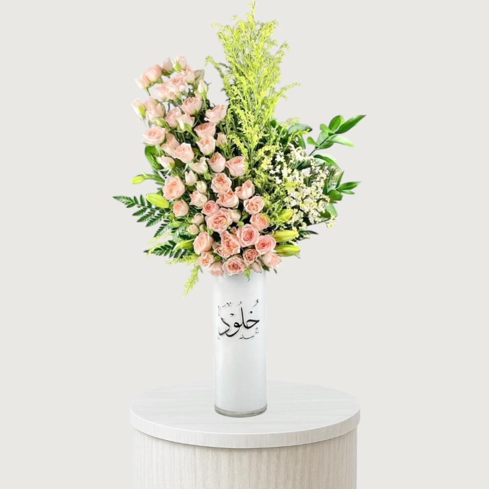 تنسيق مميز من الزهور الطبيعية داخل فازة زجاجية شفافة، اختيار أنيق يجعلها هدية مثالية تنبض بالجمال والرقي.