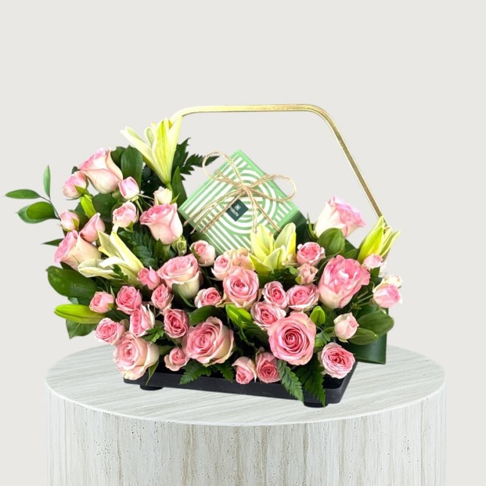 باقة ورود فاخرة بتنسيق أنيق من الورود الوردية الطبيعي الناعمة ملفوفة بتغليف أخضر فاخر، مزينة بشريط ساتان أبيض مع طباعة عبارة حسب المناسبة. خيار مثالي لتقديمه في حفلات الزواج، المناسبات السعيدة أو كهديّة تعبّر عن الحب والرقي